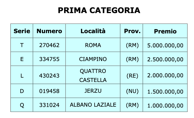 Ricordiamo che l’unico modo per ufficializzare la vincita è controllare il proprio tagliando attraverso i canali istituzionali. A partire dalla mezzanotte, l’elenco completo, comprensivo dei premi di Prima, Seconda e Terza Categoria, sarà disponibile su: